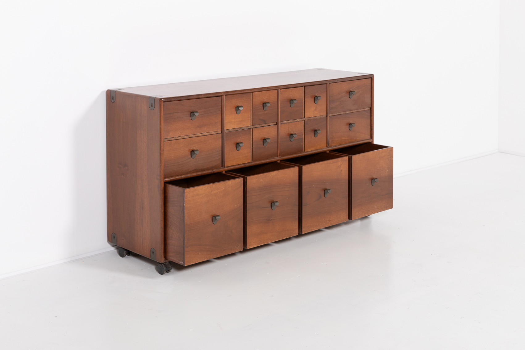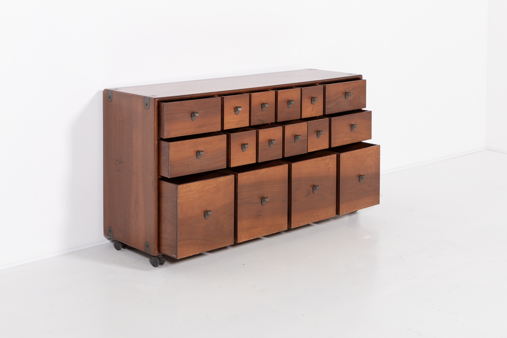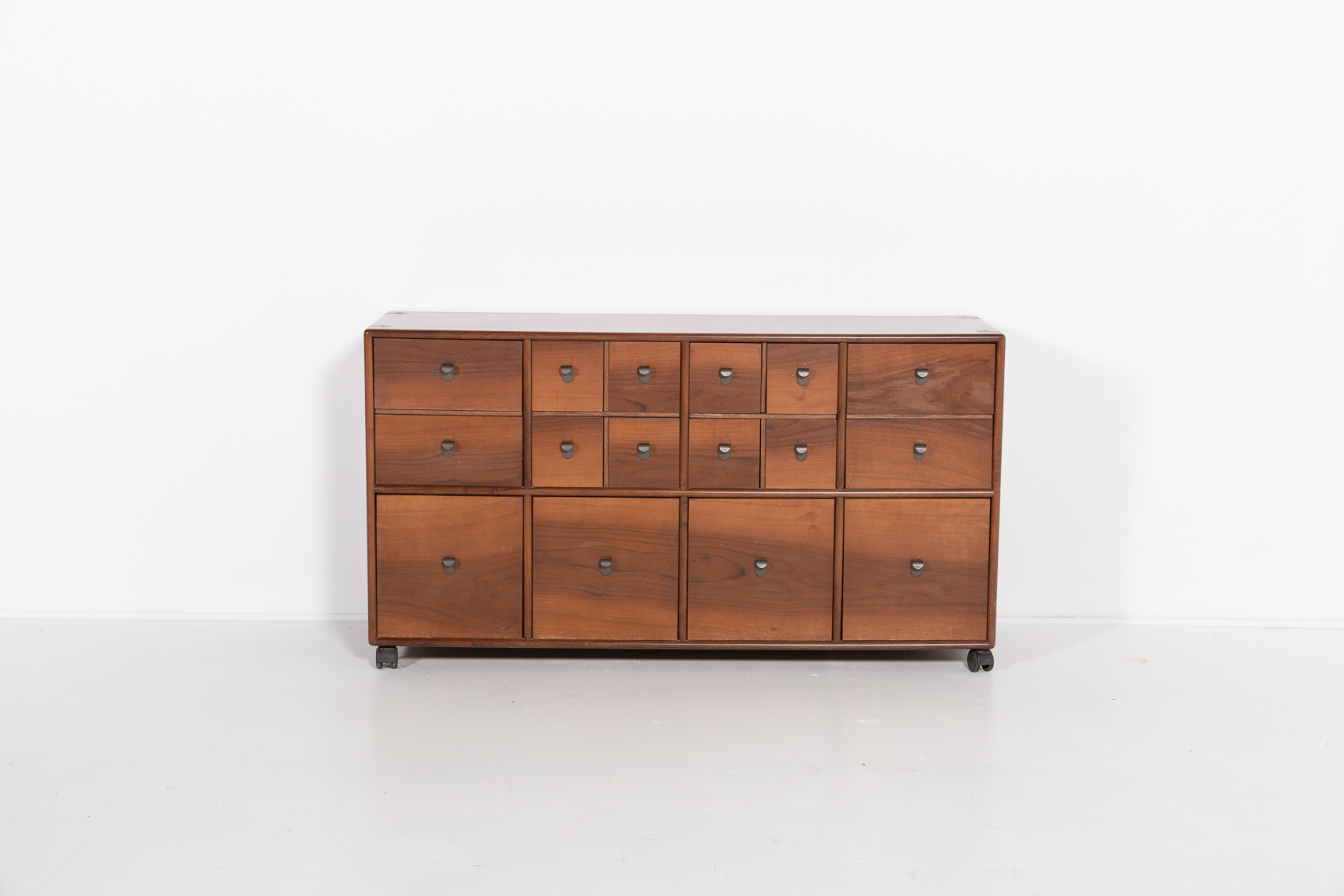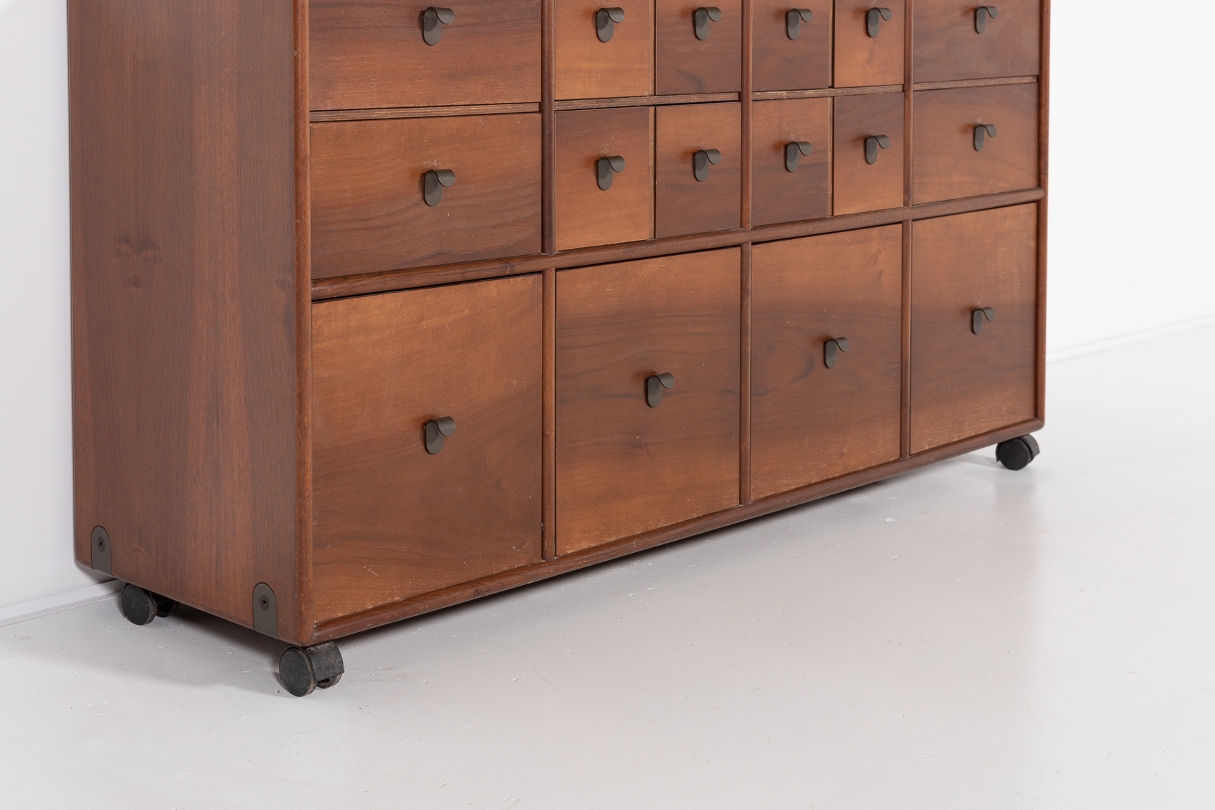 A stunning free standing walnut chest of drawers designed by Fabio Lenci for Bernini in 1970s. Nice details of curved metal handgrips, equipped on wheels.
