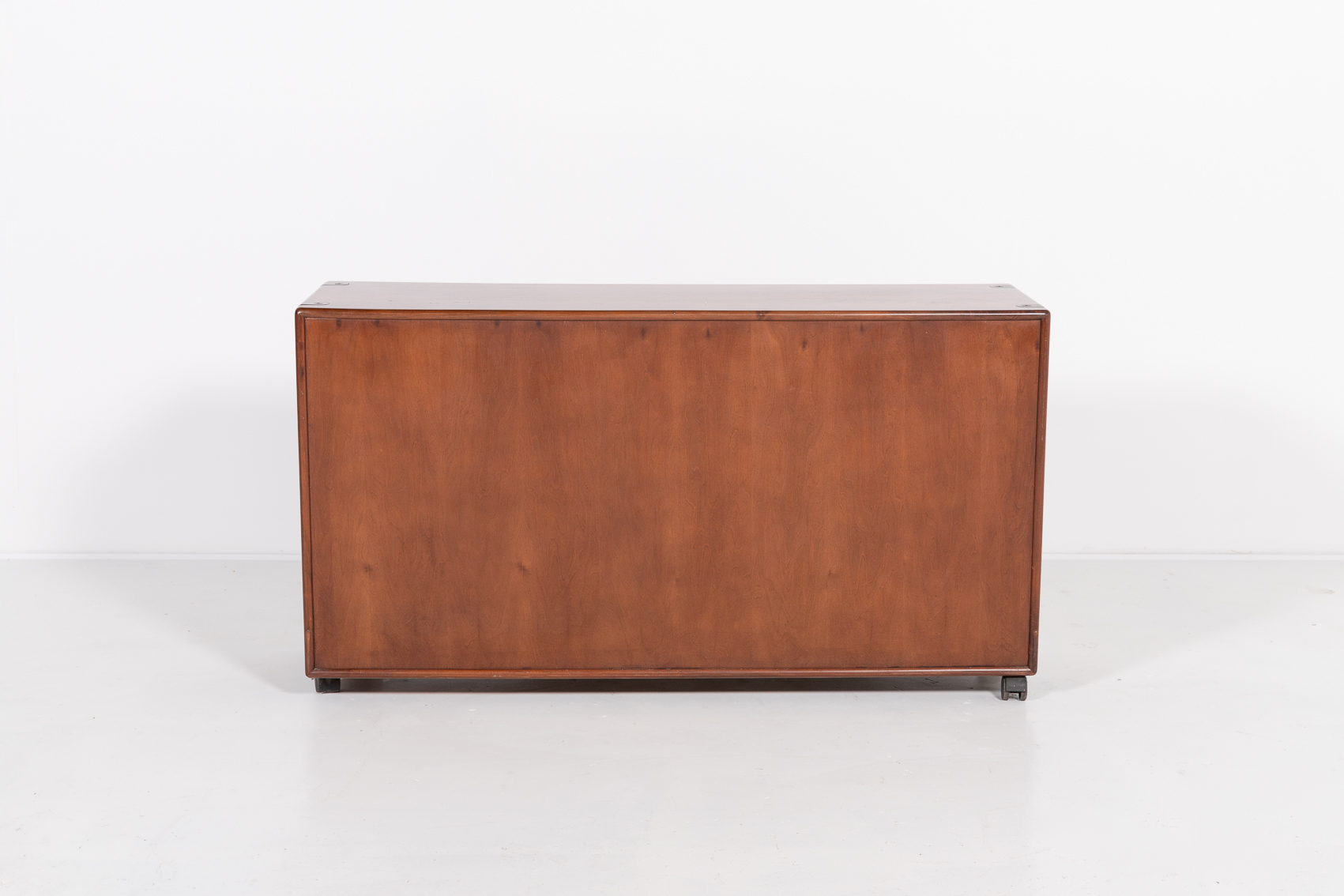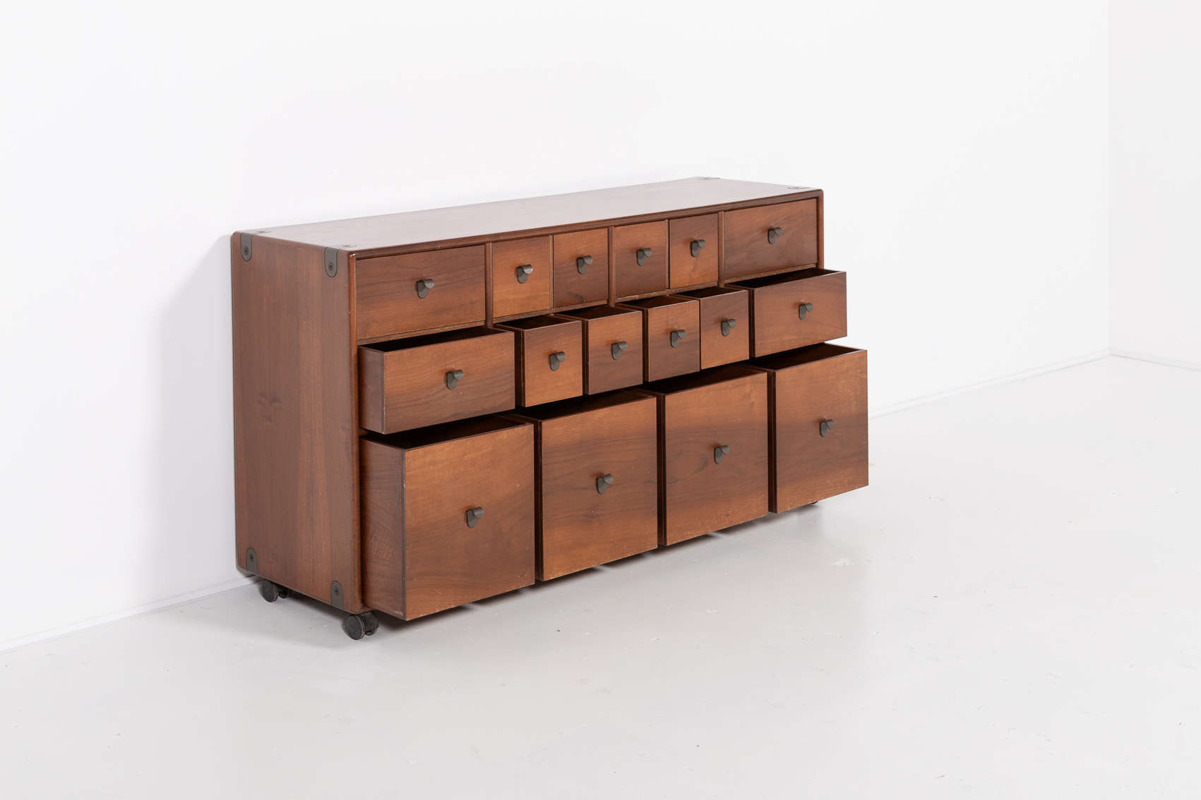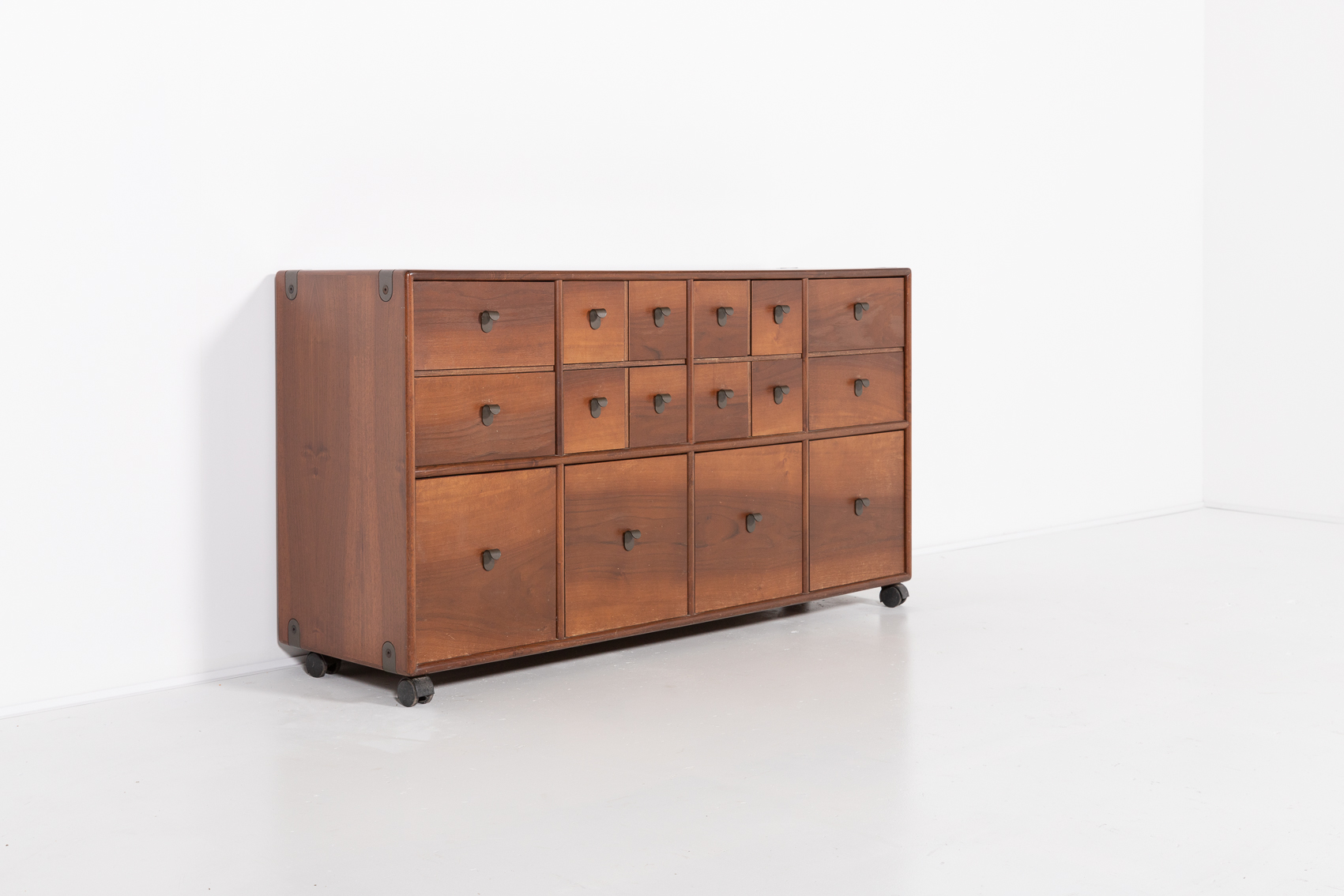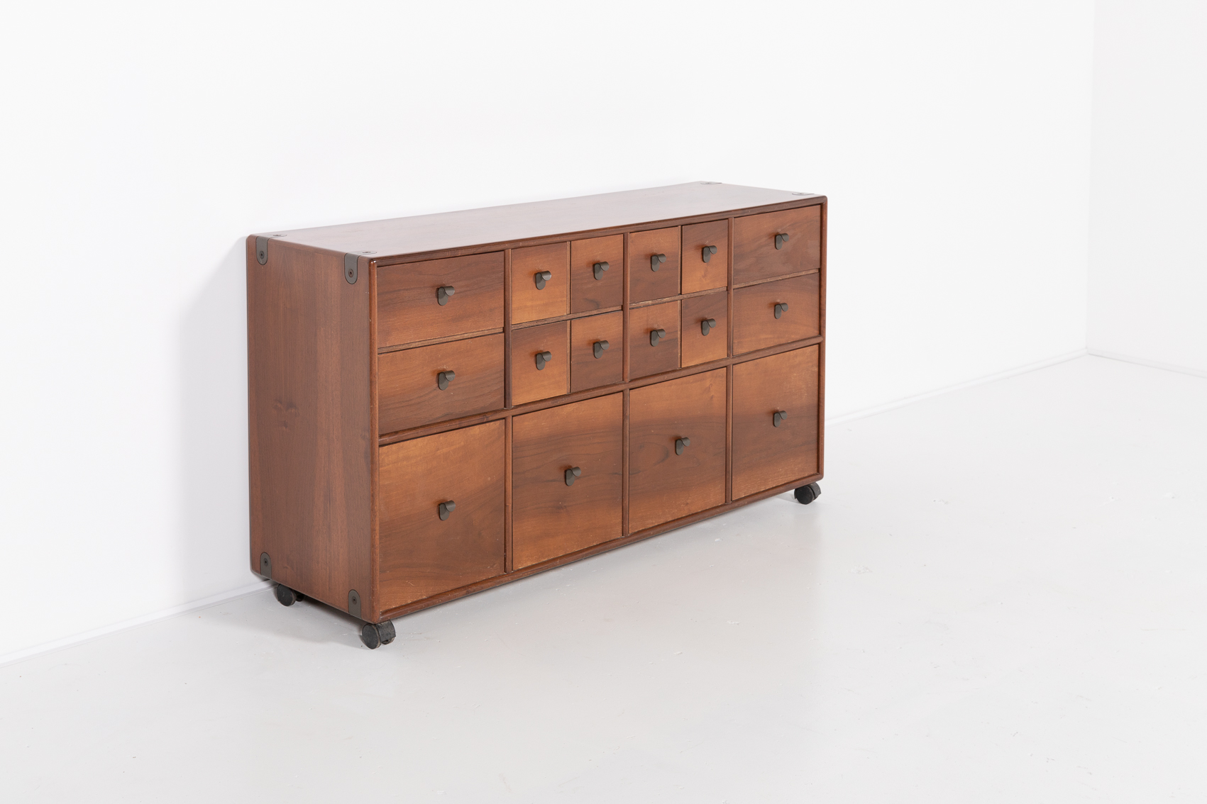 A stunning free standing walnut chest of drawers designed by Fabio Lenci for Bernini in 1970s. Nice details of curved metal handgrips, equipped on wheels.