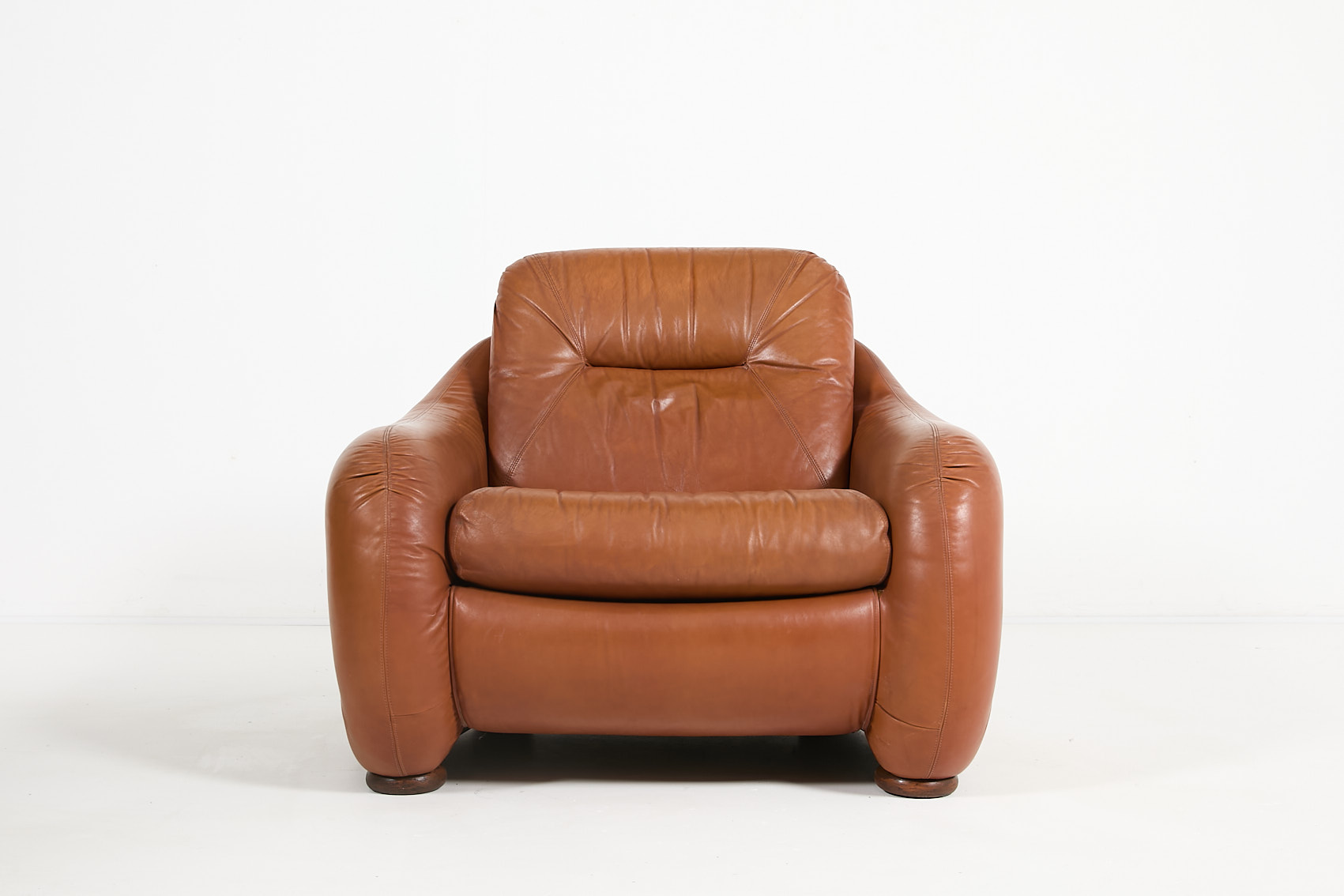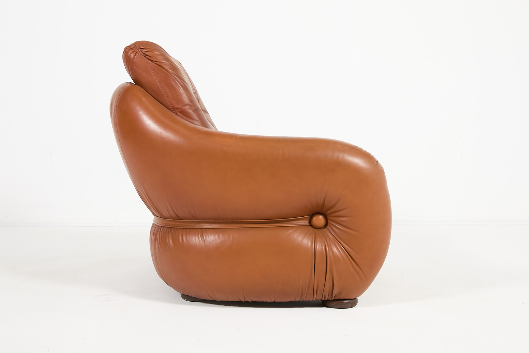 Italian mid-century modern sculptural armchair in brown cognac leather, produced in 1960’s.
